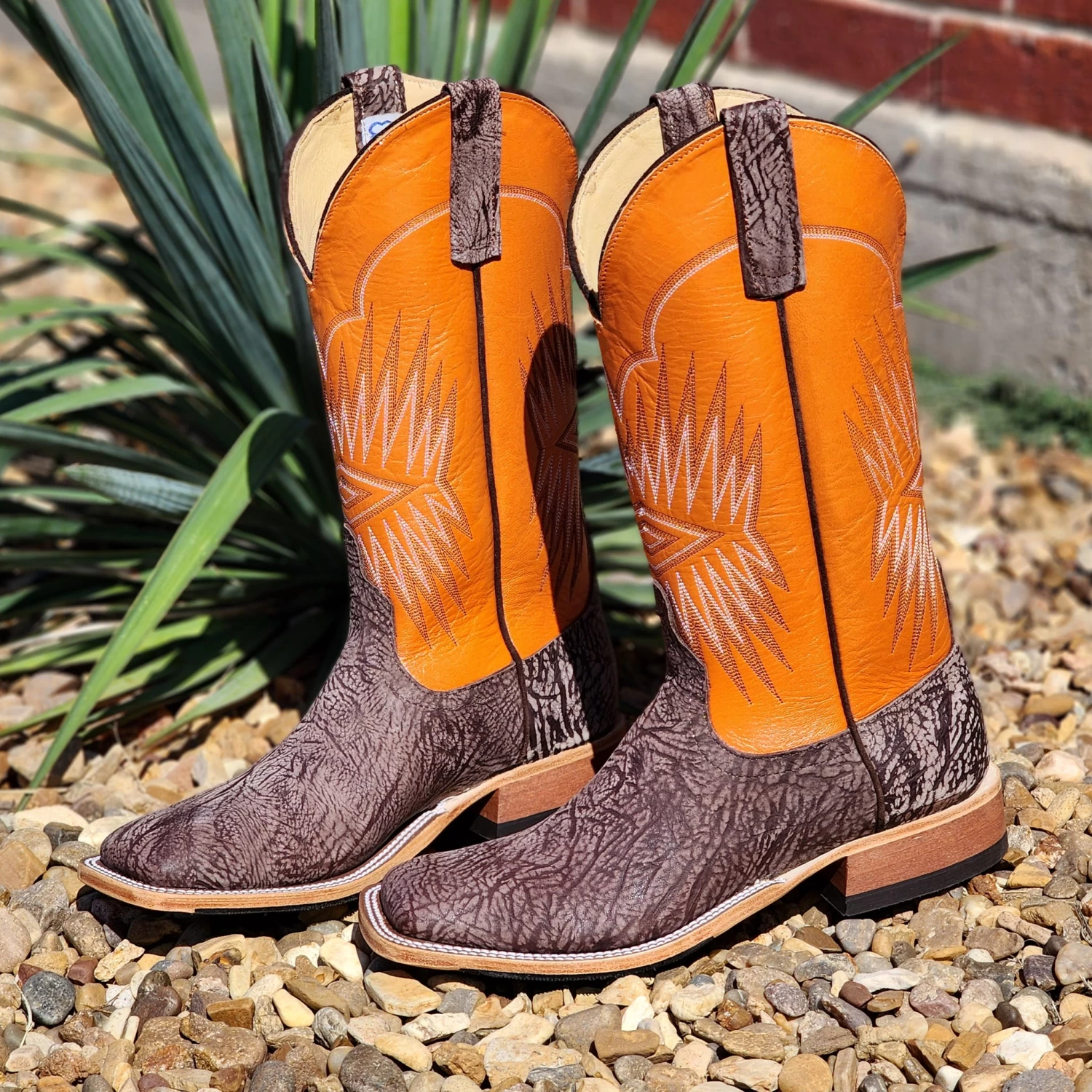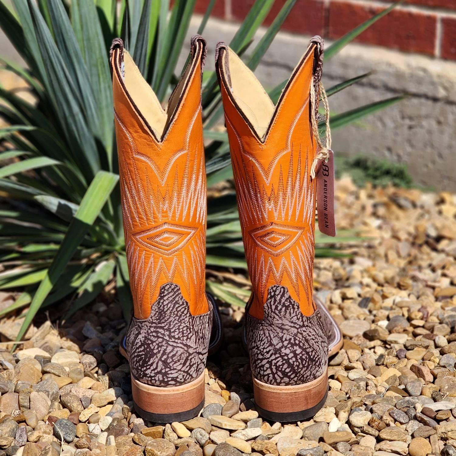 These Brown Elephant boots from Anderson Bean feature a orange shaft. Made for comfort and durability without lacking style! These Handmade in the USA Boots are tough enough to hold up to any job on the ranch or sharp enough to wear as a dress boot!