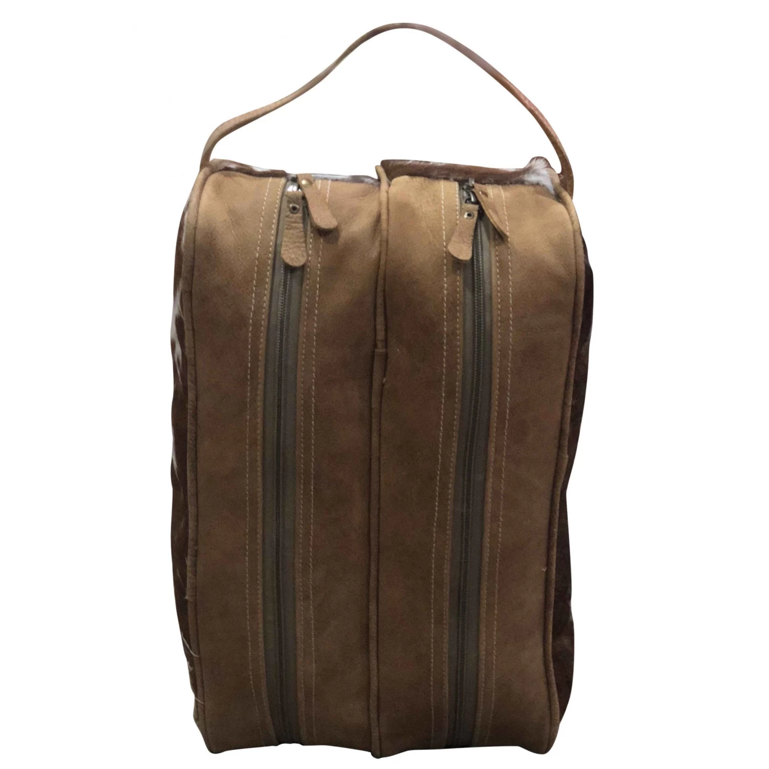 Show up in style with your boot tote! This boot tote features authentic brown and white hide. It also has two sets of zippers, one for each boot!