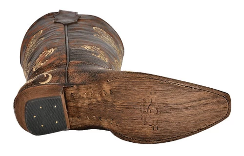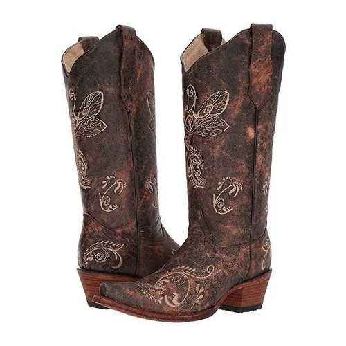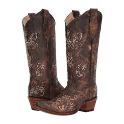The L5001 style by Corral Boots will liven up your favorite jeans or Western dress. Handcrafted leather upper with a distressed finish. Dual pull on tabs at side for easier on-and-off. Leather lined for added comfort. Intricate floral stitch detailing on vamp and shaft. Snip toe silhouette for a pointed finish look.