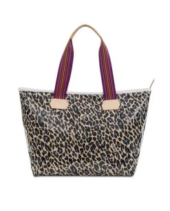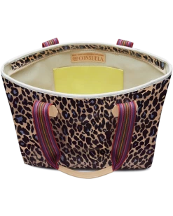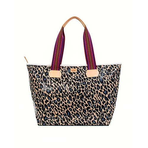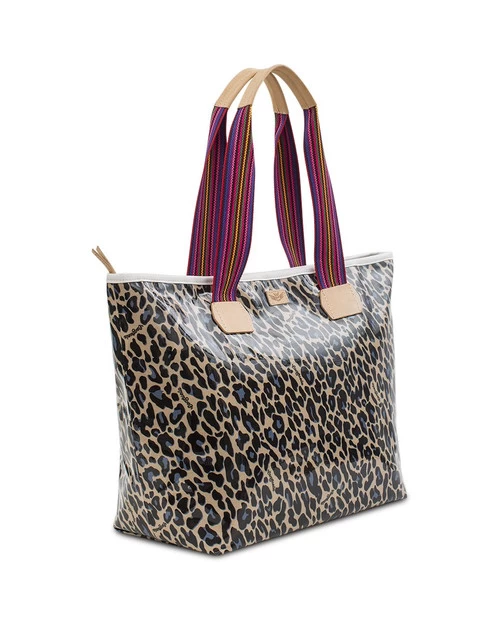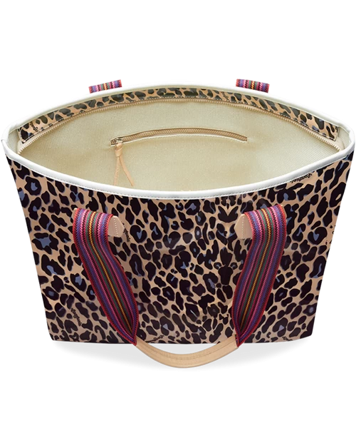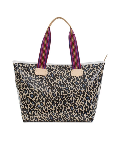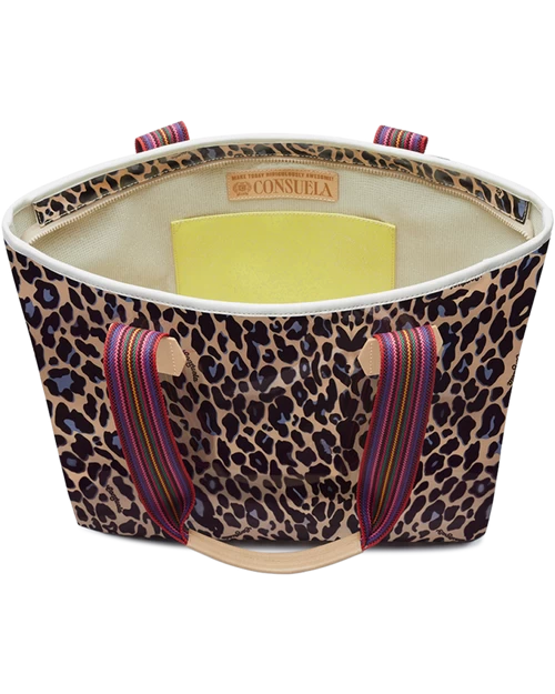 Keep your essentials zipped up and secure with our Blue Jag Zipper Tote! This tote has multi-colored webbing handles and is trimmed in natural leather. Inside the giant top-zip opening you’ll find a zippered pocket and a large pocket in Black Dot made with ConsuelaCloth™, known for being durable, vibrant, and easy to care for. The inside is lined in Black Dot print.