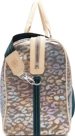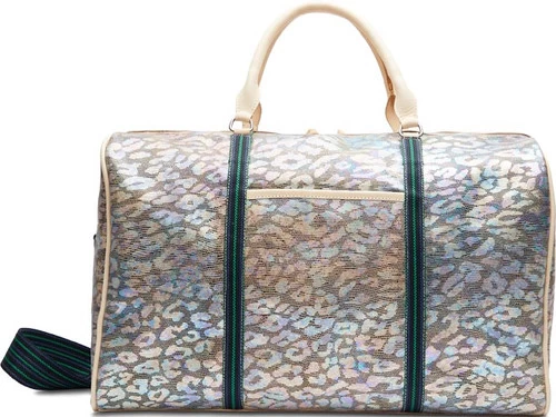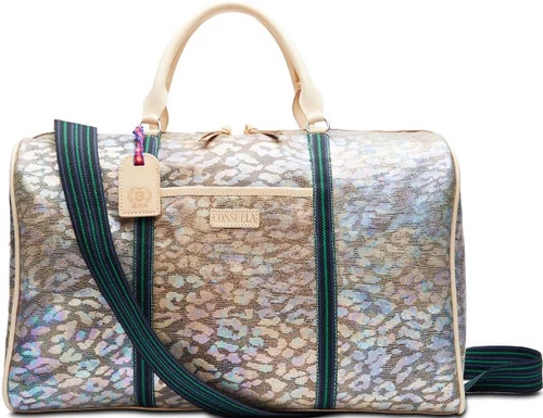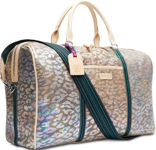 Consuela’s largest duffel style, the Weekender, is our go-to for big hauls. This Kat duffel is roomy enough for all your essentials and features leather handles, an adjustable cross body length webbing strap, two interior pockets, and two exterior pockets. If you’re looking for a TSA carry-on compatible bag, check out the Jet-setter or the Zipper Tote!