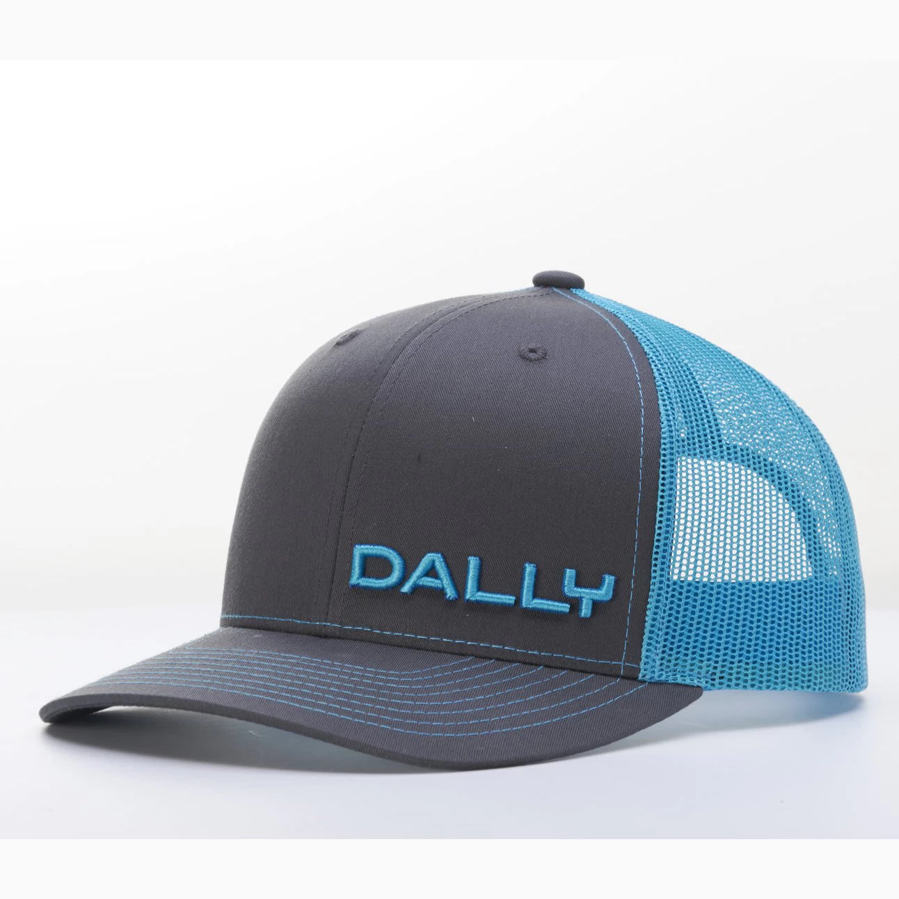 This cap from Dally Up features a charcoal front with blue stitch lettering in the lower right hand corner reading, “DALLY.” The back is made of blue mesh and has an adjustable snap closure.