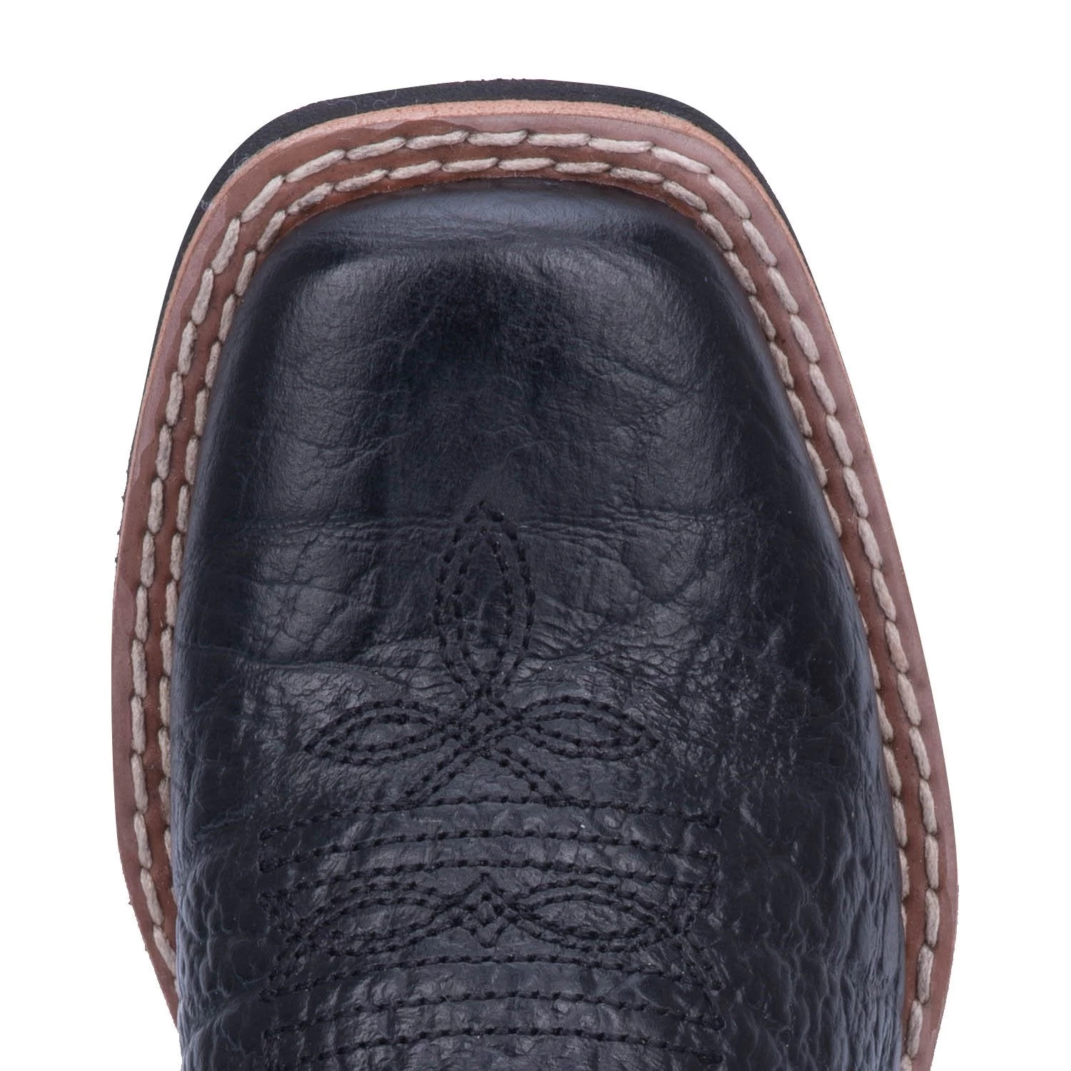 This kid’s square toe boot from Dan Post features a gorgeous black foot and brown upper with tan and red stitching! There is a comfort cushion for comfortable feet and a rubber sole for no falling!
