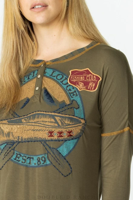 This casual long-sleeved tee is a fun everyday piece with an outdoorsy attitude. The soft olive shade gives us all the fall feels and the camp-style canoe image/embroidery with the fisherman’s club patch makes ya want to get out on the river!
