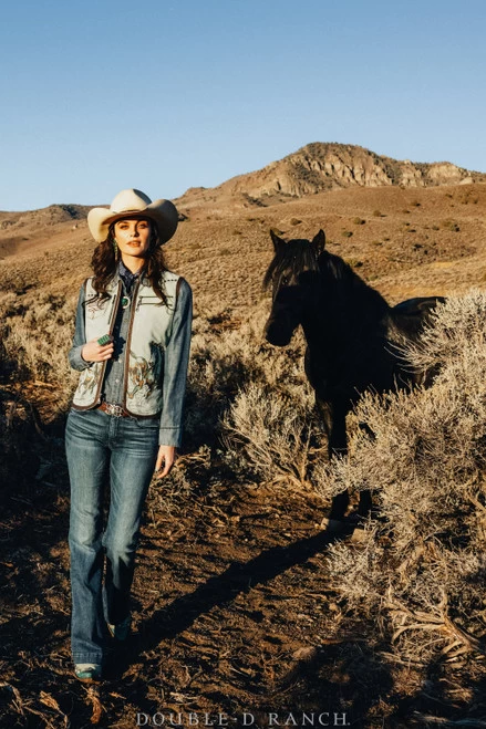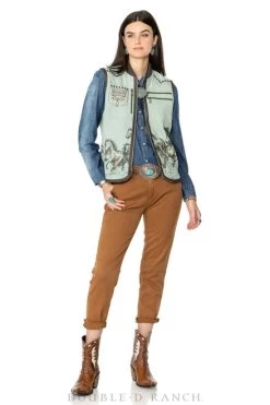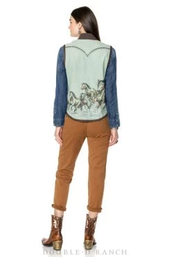 The Wild Horses Vest really embodies the spirit of the collection. The soft spring green is one of the significant shades in the collection, the toebox-style stitching captures the western aesthetic, and the imagery of the wild horses is so beautifully depicted and has such good motion that you can almost hear them running. It’s bold, but versatile, and very polished with its contrasting trim and sleek studding.
