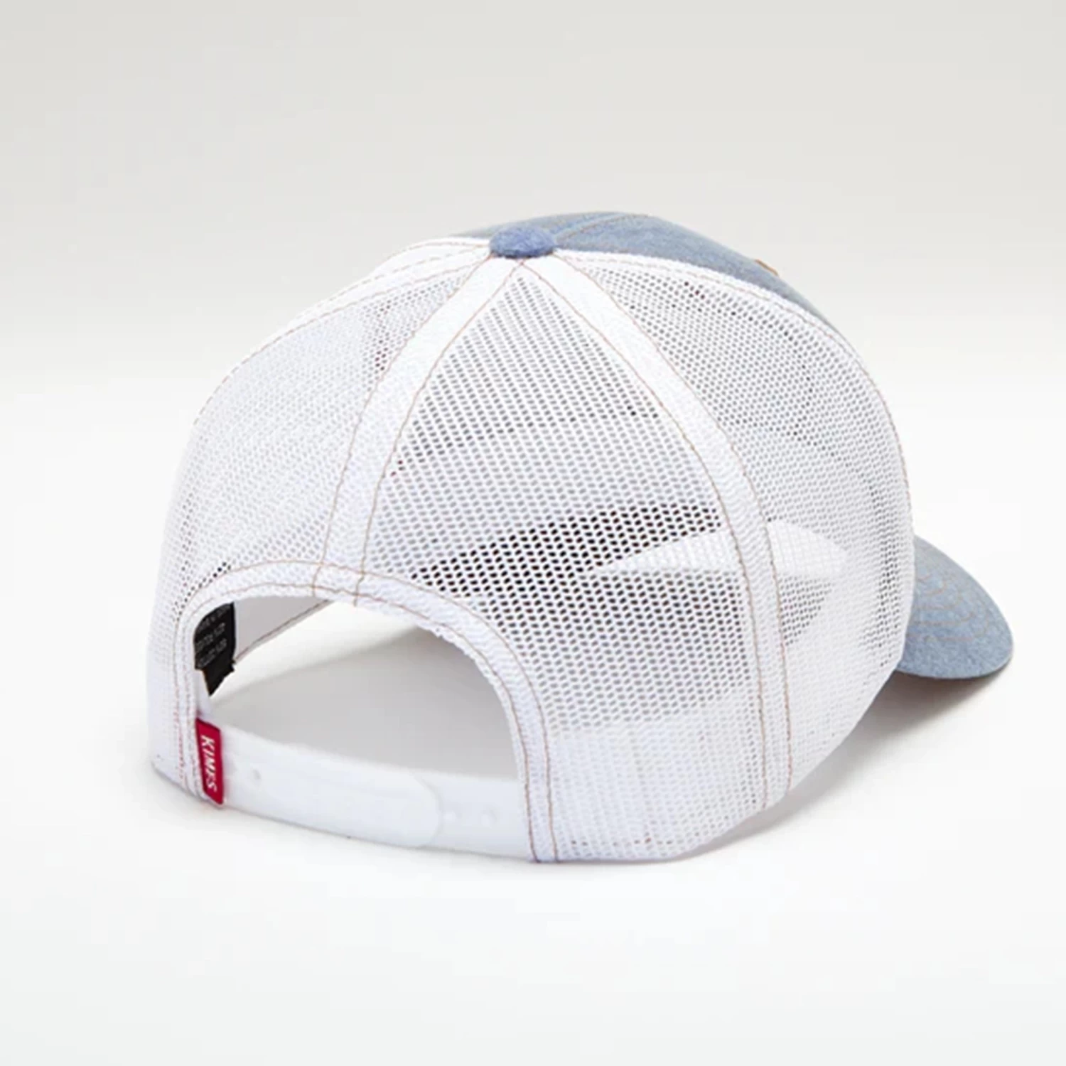 Kimes Ranch denim cap with white mesh back panels for ventilation. Adjustable backstrap for proper fit. Kimes Ranch Patch.
