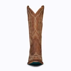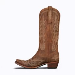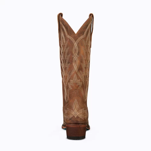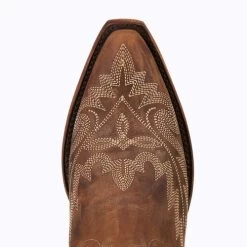 She’s the perfect brown cowgirl boot. Heirloom quality with a western vibe. The classic snip toe profile is embroidered to perfection with a twist on traditional flame stitch. Burnt Caramel finish makes this a perfect fit for everyday to girl’s night out.