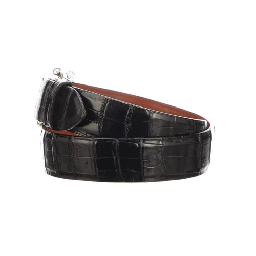 The belts silver plated buckle has Western elements that complement the exotic hornback leather, adding a unique touch.