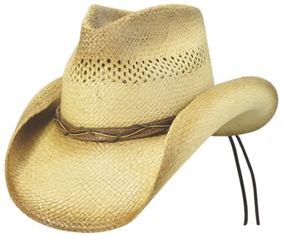 - Pinched front, hand braided fine crushable panama straw, vented, with brown leather hatband, tea stain.