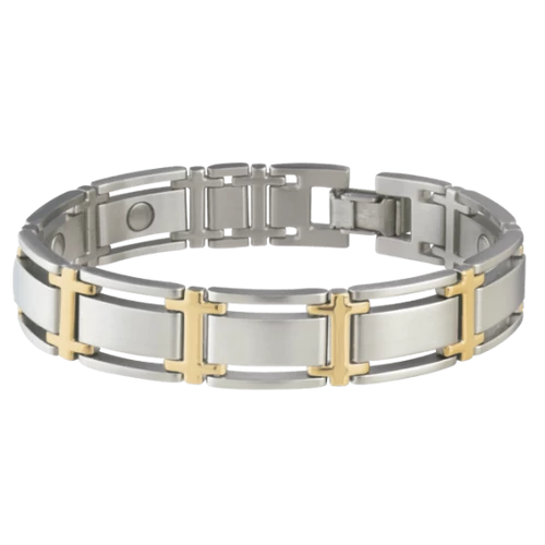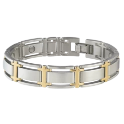 This bracelet is a smart combination of matte stainless steel and gold plated accents, designed to look great in the boardroom or with your best casual wear. There is a 1200 gauss Samarium Cobalt magnet in each large link! Sabona chooses Samarium Cobalt magnets for long term durability and rust resistant qualities.