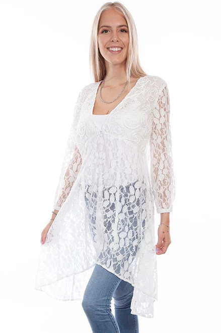 This delicate lace duster will lift your spirits to new heights. It features a button front closure with a low “v” neck and rope inspired soutashe bodice. It has long sleeves with elastic cuffs.
