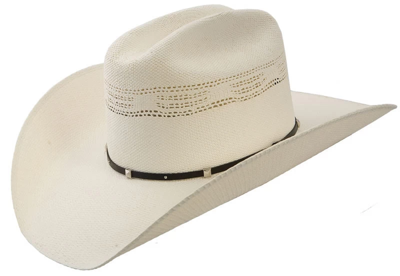 The White Horse straw looks like a traditional bangora straw, but is a dressed up version! The black leather hatband with silver square studs really makes the hat stand out.