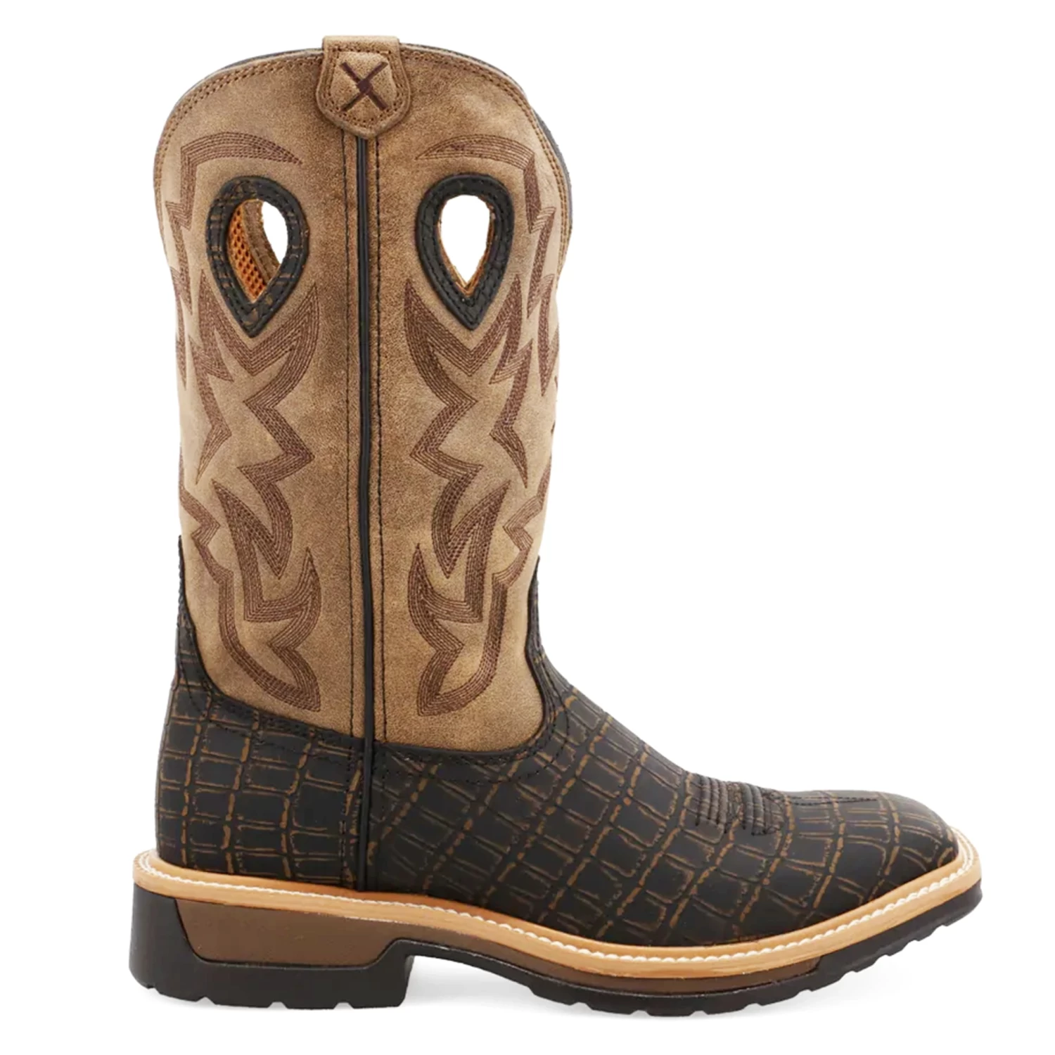 Twisted X Men’s 12″ Lite (weighs 15% less) Western Work Boot is handcrafted in full-grain leathers. On the inside, they utilize air-mesh lining, taped seams, and a Twisted X® molded footbed for additional comfort. There is a double-stitched storm welt, full-length composite insole, a lightweight full-length compression-molded EVA midsole, and an oil/slip-resistant molded-rubber outsole to produce an industry leading work boot.