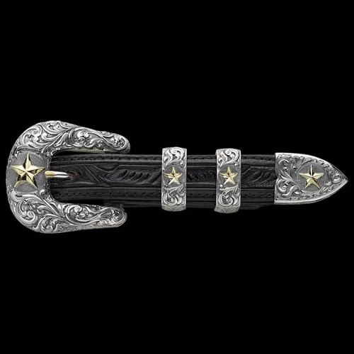 The CV Dunlap – 1″ is hand cut bands of applied, solid sterling scroll work cover this gorgeous, antiqued sterling buckle set. The silver on silver combination provides for a look of depth and character. Each of the four pieces are adorned with solid 14 karat gold stars. Built to fit on 1″ belt tabs but can be custom ordered for 3/4″ and 1 1/2″ widths, call or email to inquire. Like all pieces in the Signature Series, the buckle and tip backs are fully hand engraved and finished with Chet’s signature. Also, each piece uses a heavier gauge of sterling than those in the Classic Vogt line, and are individually numbered.