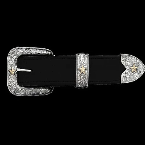 The Senator 1-1/2″ is a very popular set combining 14 karat gold fill stars, a fine hand twisted rope edge and hand engraved, antiqued sterling base. The lines of the buckle are very clean and contemporary while the accents are very western…a great combination of design elements.