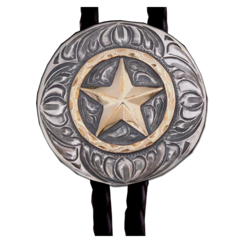 Hand Engraved Sterling Silver Bolo Tie with Gold Star and Disc. The tradition of the bolo tie continues with Vogt Silversmiths. Vogt has designed this 1 1/2″ hand engraved, sterling silver bolo tie. It is accented with a 14 k gold fill 3-dimensional star surrounded by a serpentine engraved disc.