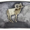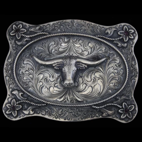 The Painted Desert combines the hand engraved oval center featuring a dimensional Longhorn, framed by an antique engraved, scalloped base. Flowers with ruby centers are nestled in each of the corners and joined to the center by twisted rope vines. This buckle measures 3 1/2″ across by 2 5/8″ tall.