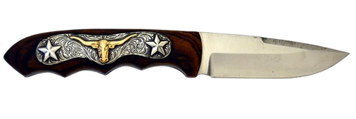 The hand engraved, sterling silver inlay features a 3-dimensional, 14k gold fill, cast longhorn, while the underside of the knife reveals two inlaid sterling silver stars.