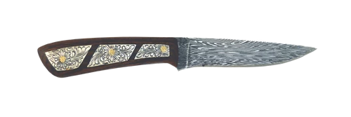 The 3 1/4″ Damascus blade is hand forged from 1075 steel and 15n20 hi-carbon steel, heat treated and polished.