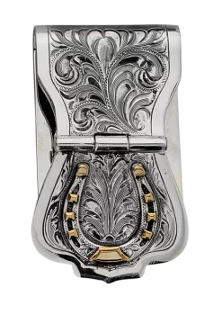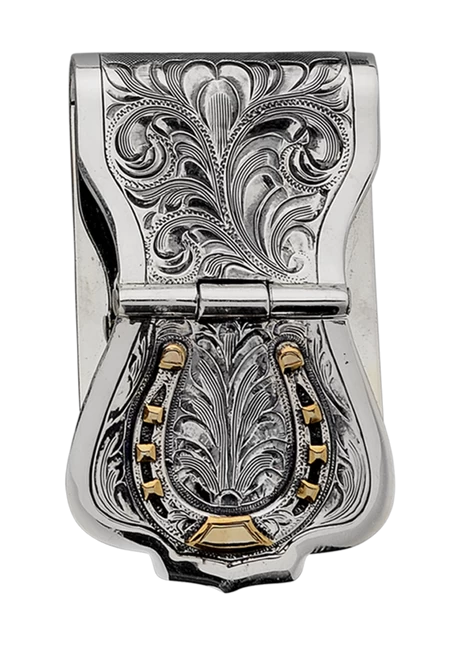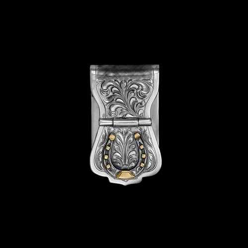 Hand Engraved, Hourglass Shaped with Gold Horseshoe Money Clip