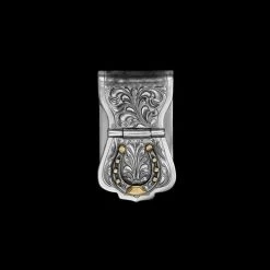 Hand engraved wide money clip featuring a hinged cam that secures the clip’s contents and a solid sterling horseshoe with 14 karat gold fill accents. The clip measures 1 3/8″ across and 2 3/8″ long. All of our money clips are made of solid sterling overlay which gives the clips added tensile strength.