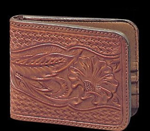 The wallet is cut from American saddle leather and hand carved with an intricate floral and basket tooling pattern.