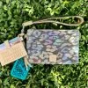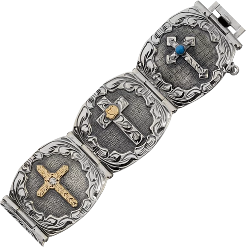 Six hand engraved, uniquely designed sterling crosses adorn a hinged barrel-concho style bracelet. Each cross is set on an oxidized sterling background. The diameter of the bracelet, when clasped, is 7 3/4″.