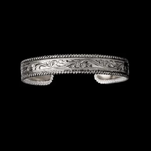 A 5/8″ wide, hand engraved silver cuff with twisted rope edge. Simplistic in style the engraving detail is eye-catching. Unisex.
