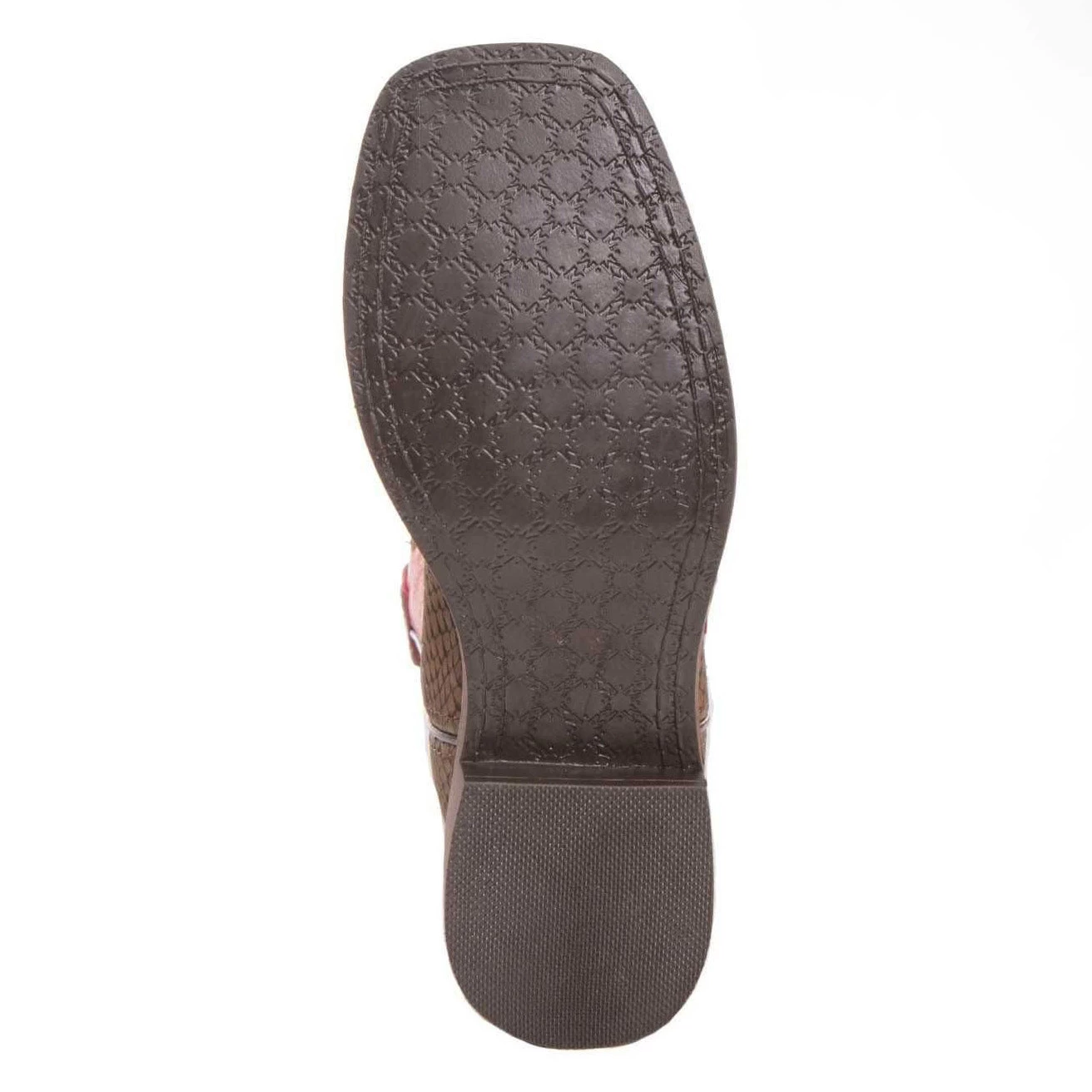 These western boots feature a fun viper snake print on the foot with a square toe. The top is a rust-red color that has a black and white stitch pattern. They’re the perfect boot for a kid who loves to be out in the barn or going to school.